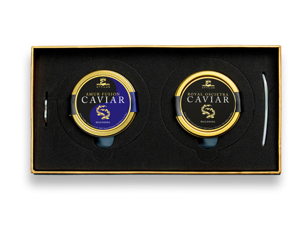 This caviar set is presented in an elegant, specifically designed exclusive Attilus Gift Box with two tins of caviar from our selection, as well as a Mother-of-pearl spoon and a caviar tin opener. The sets are available for 50 and 125g tins.